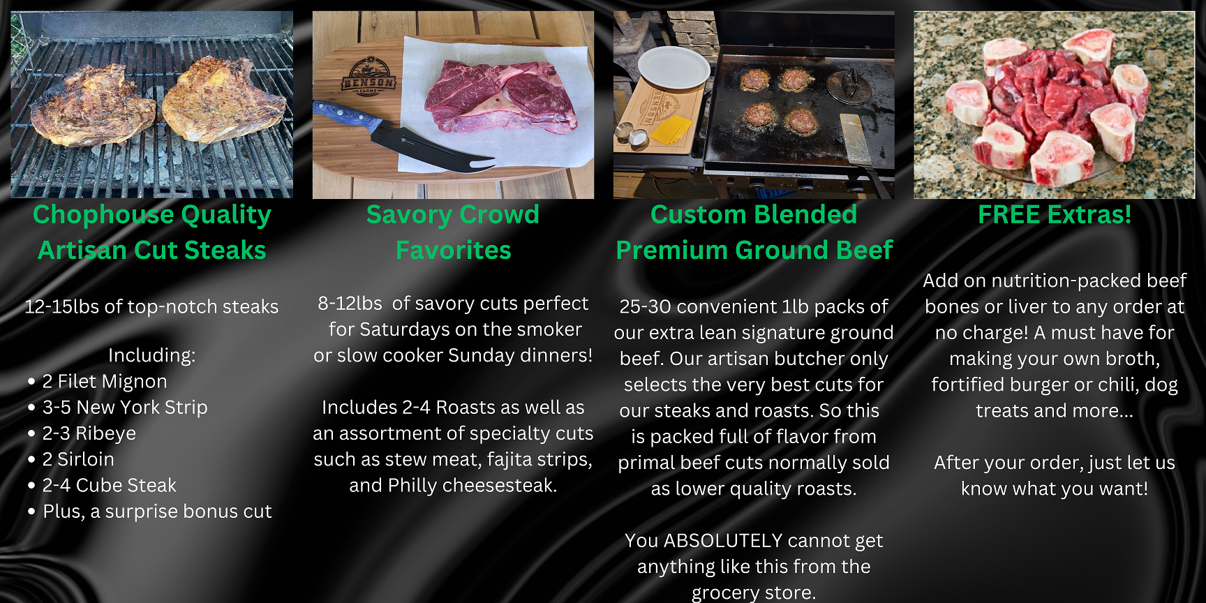 I split a beef order with my parents. Pick up was a breeze and the process could not have been any easier. Living in North Alabama my family and I have had plenty of opportunities to try farm to table beef and the beef from Benson Farms has been the best we have tried. We will definitely be repeat customers.