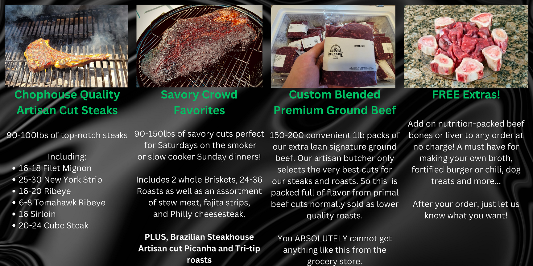 Each package contains an assortment of chophouse quality steaks, savory roasts, and our signature Premium Ground Beef custom blended by our artisan butcher.